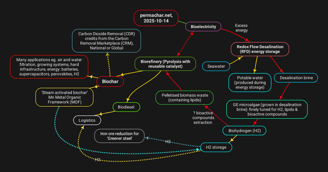 Bioelectricity->power a 'biorefinery' with excess to Redox Flow Desalination (RFD) (seawater input)->Energy storage + potable water (simultaneously), desalination brine->GE microalgae (grown in desalination brine)->biohydrogen (H2) + biomass waste (containing lipids)->Biorefinery (Pyrolysis + reusable catalyst)->Biochar, biodiesel, bioelectricity (+ Carbon Dioxide Removal (CDR) credits for the biochar from the Carbon Removal Marketplace (CRM))