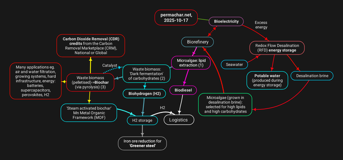 and/or biodiesel)->bioelectricity and biochar->Redox Flow Desalination->potable water and energy storage->powering 'Green Hydrogen' electrolysis (potable water or ideally